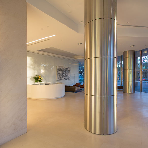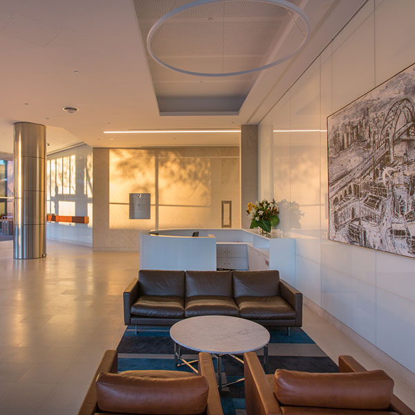 Both lobbies received new wall finishes (stone and colour back glass) along with new flooring (stone and refinishing of existing). Feature rugs were inset into the flooring, and stainless steel cladding to columns was installed. Both lobbies received updated signage and designer furniture resulting in a sleek and modern finish.