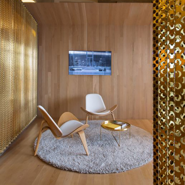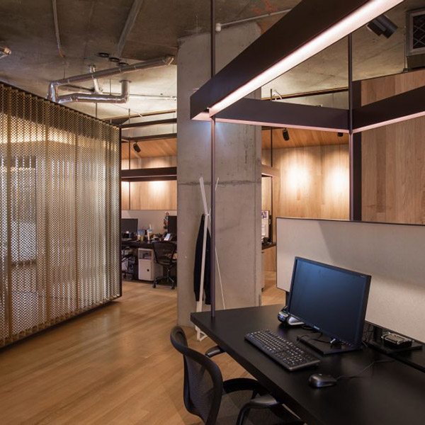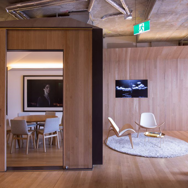 Using architectural steel and American Oak as the core materials of the project, the concept of a house within an office was developed. Independent meeting rooms have been created to provide privacy as well as a unique design. Each meeting space or ‘pod’ has been constructed out of a steel frame clad with oak and accented with brass and glazing.