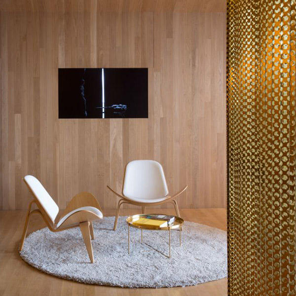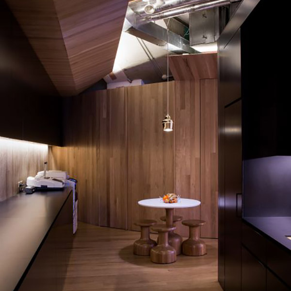 Both the floor and walls have been clad in American Oak with extreme precision. The timber cladding to the wall terminates in an angled pelmet. Accented with strip lighting, this highlights exposed ceilings and ‘roofs’ of the pods.